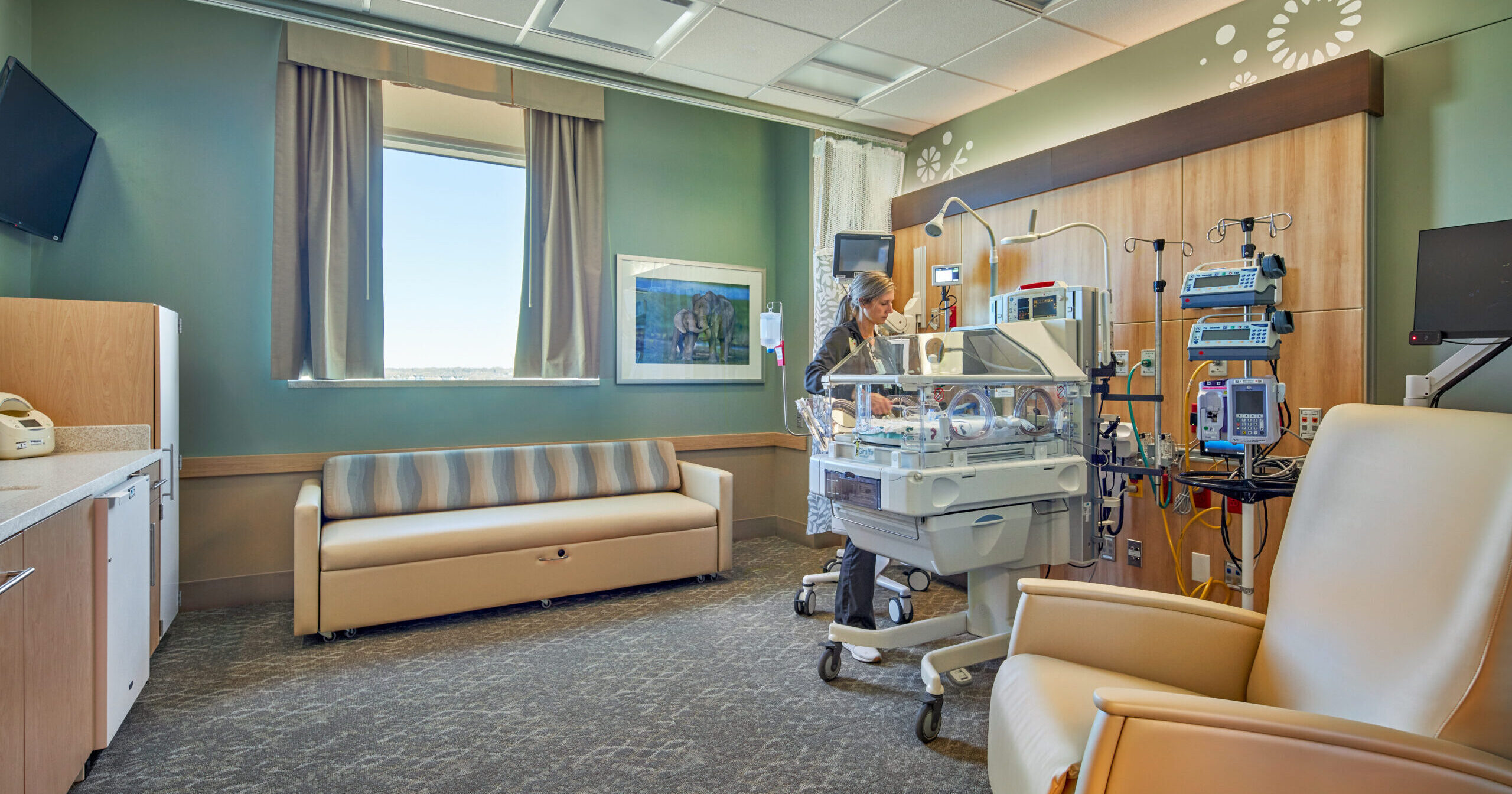 The new 10,000 s.f. NICU expansion was constructed over the existing, occupied hospital labor and delivery rooms requiring extensive Interim Life Safety Measures, a thorough Infection Control Risk Assessment, and constant coordination with hospital staff. The expansion added 12 new private patient rooms, two of which are protective environment rooms and two twin rooms for a total of 16 additional bassinets as well as supporting staff areas, special acuity space for twins, and provisions for natural light. Materials were selected to address acoustical concerns as well as the installation of sensors to alert nurses of heightened noise levels. To create a seamless flow throughout the hospital, finishes were chosen to aesthetically match the existing interior and exterior.