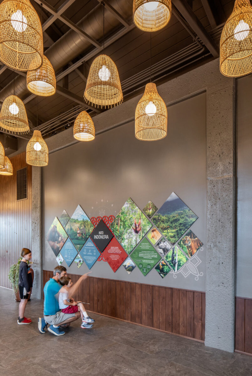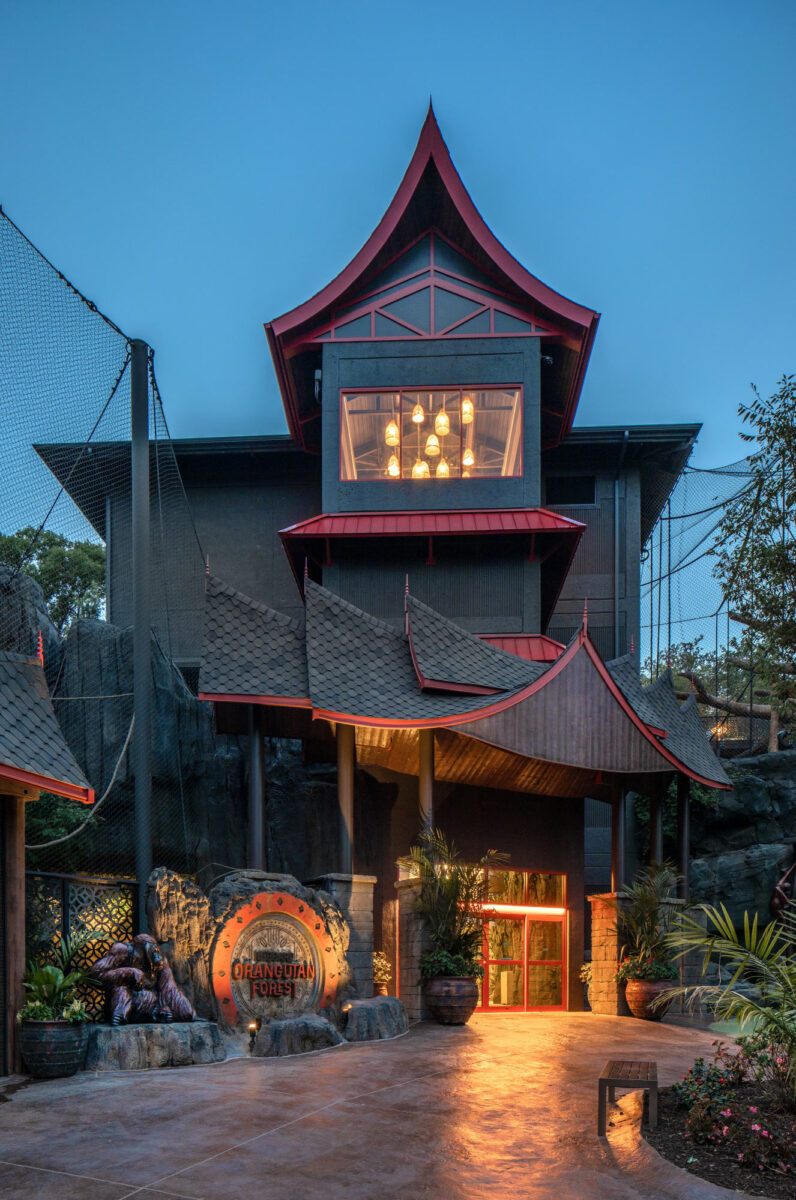 The Holland Basham design team executed an innovative and forward-thinking design concept for the new orangutan forest. Much research was devoted to ensuring the theming, architecture, and interior finishes replicated that of the animals’ original habitat. Technically, this project is very complex, with selective demolition of portions of an existing building, installing new structures adjacent to the remaining building, and keeping all program spaces within the structure with proper adjacency. At the same time as combining all of the building’s physical spaces, the entire exhibit needed a complete overhaul to retheme and bring the visitor experience up to the excellent standards and expectations of the Zoo.