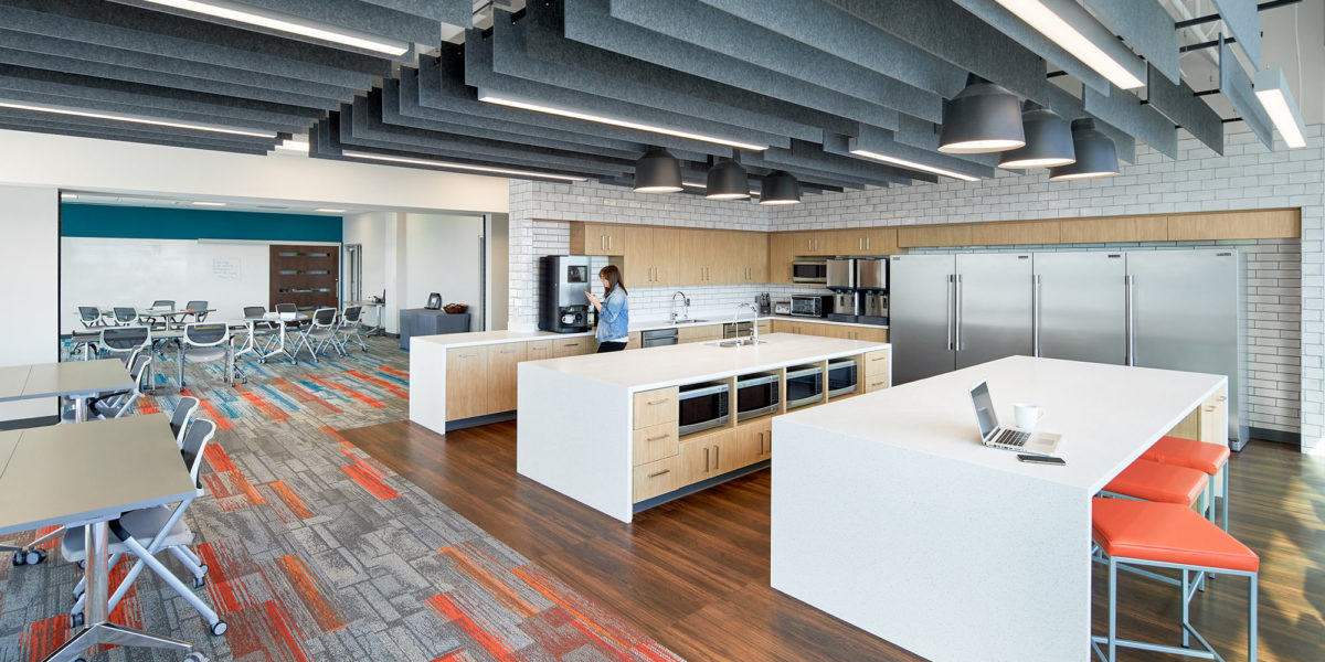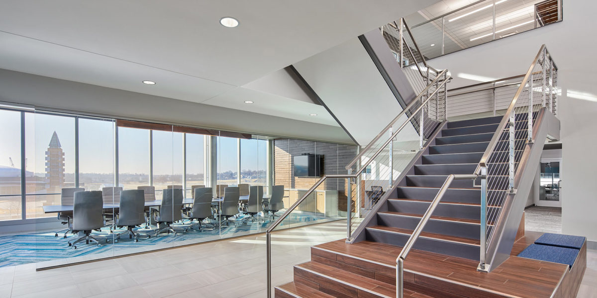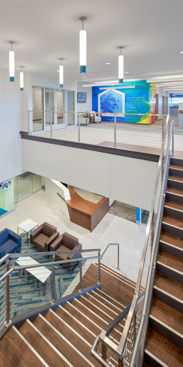 This 36,000 s.f. tenant improvement is located on the 4th and 5th floors of the Right at Home Mixed-Use Building in Aksarben Village. The environmental graphics throughout the space reinforce the company mission and brand. The views of the surrounding neighborhood are captured throughout the office to capture the community spirit. The break room and training room provide a large and flexible meeting space for employees to gather.