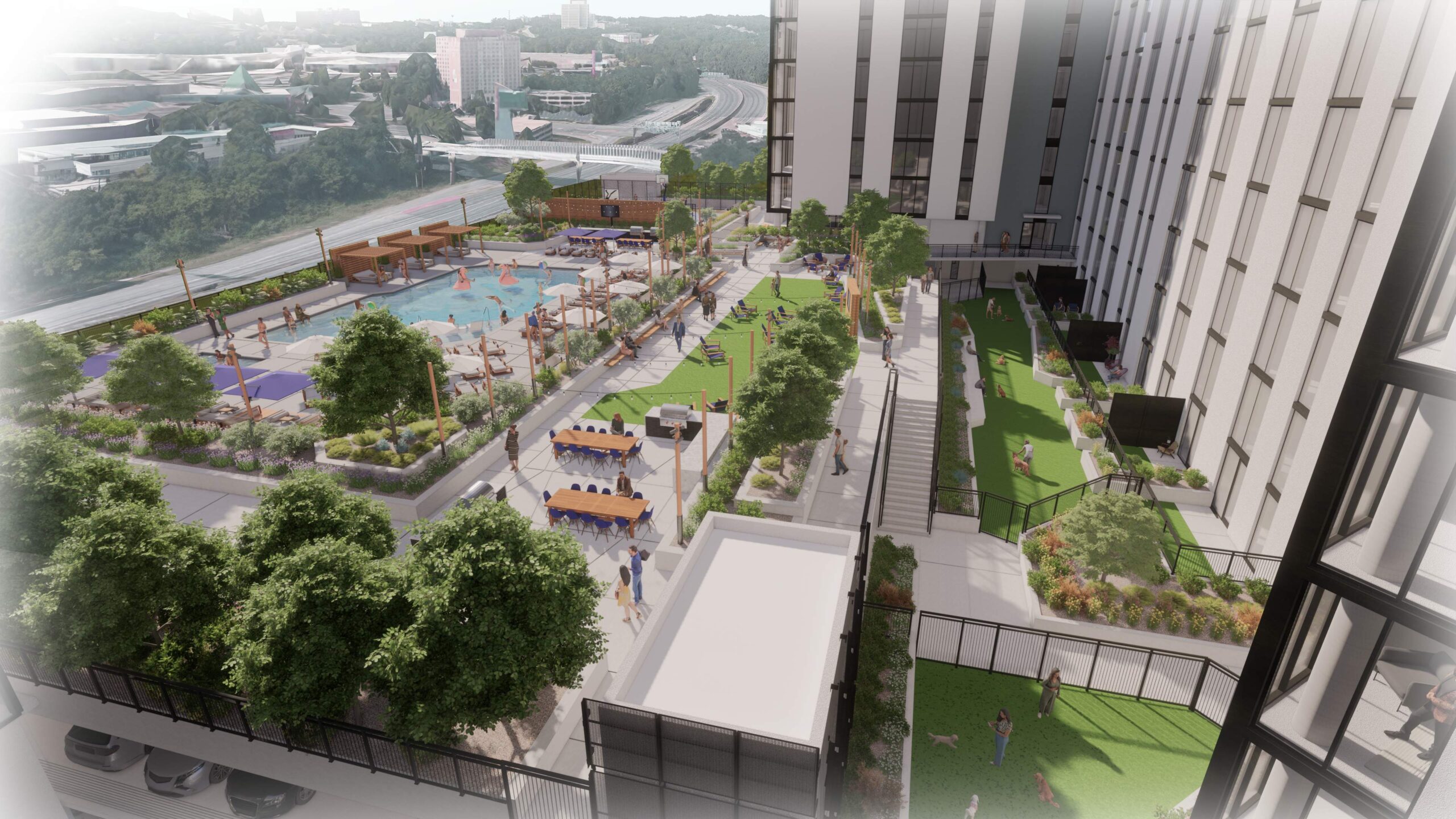 - Outdoor amenities include a signature pool, dog park, rooftop bar, and lounge with views of the Atlanta skyline