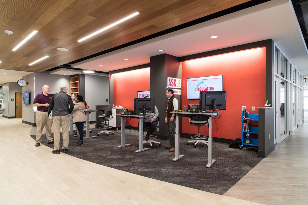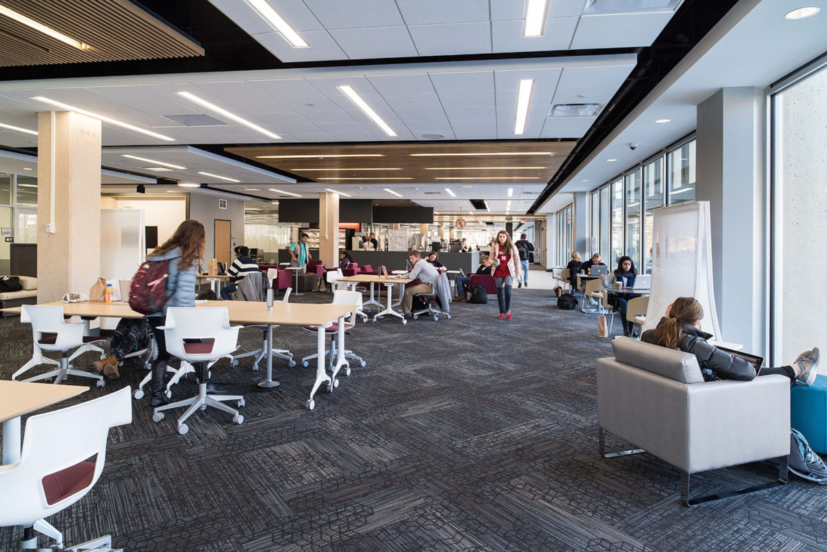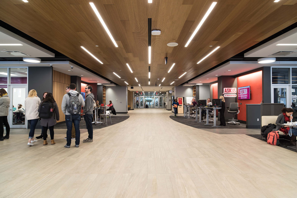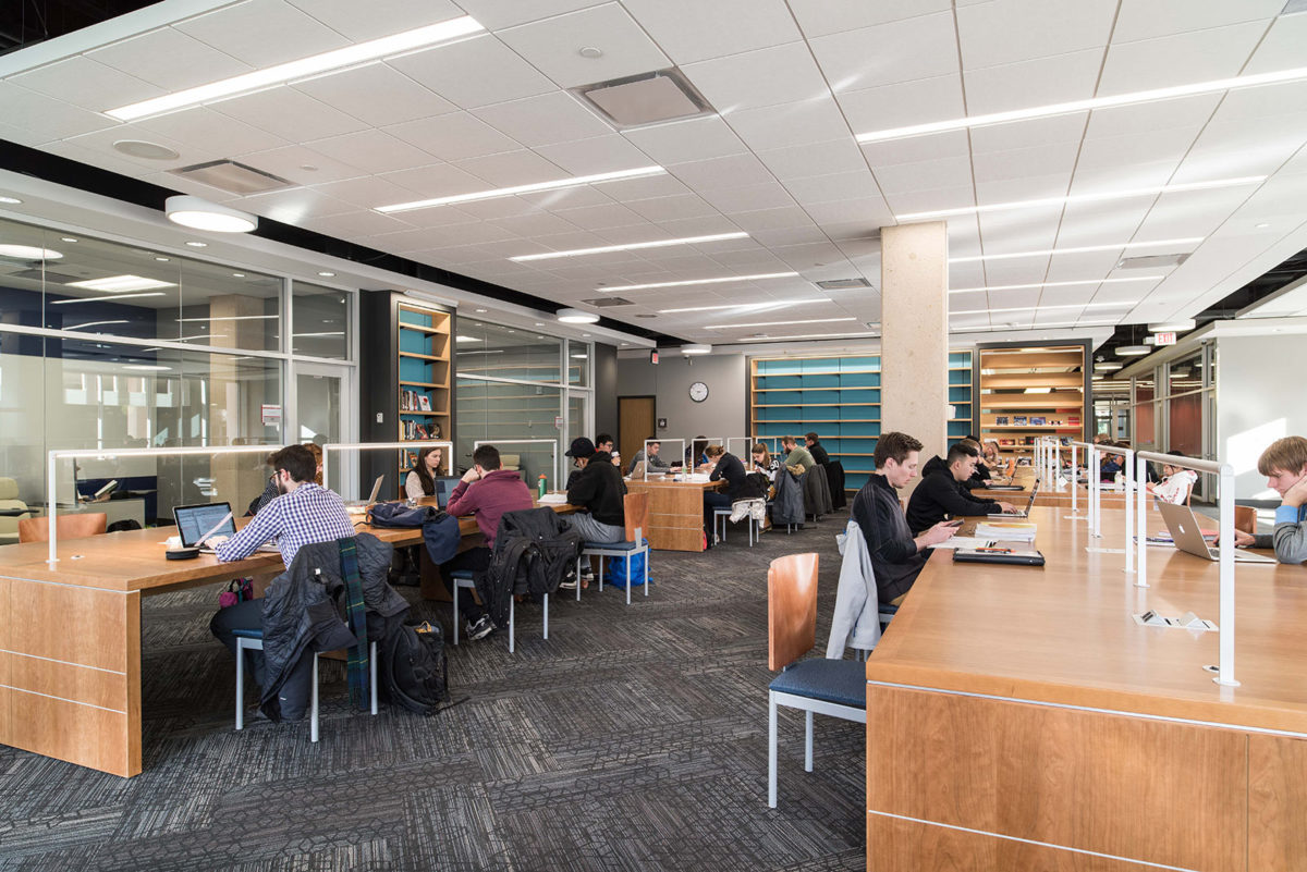 The transformation of Love Library’s first floor into a Learning Commons required an overhaul of a traditional library space to include more study area and fewer books. The north entry was also reopened with a new iconic feature and outdoor plaza.