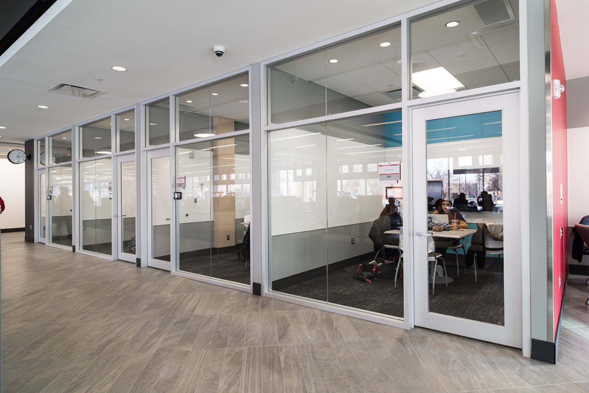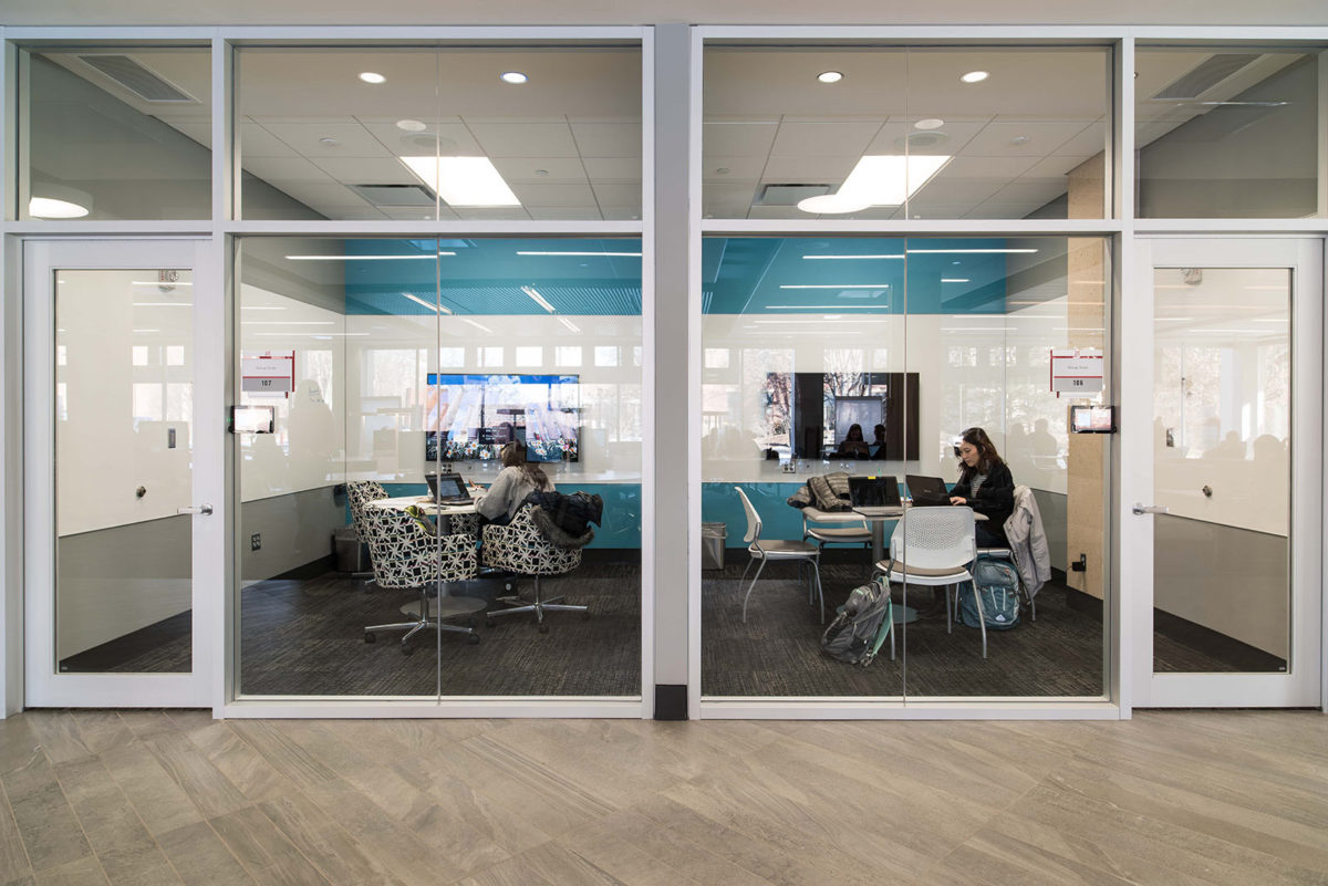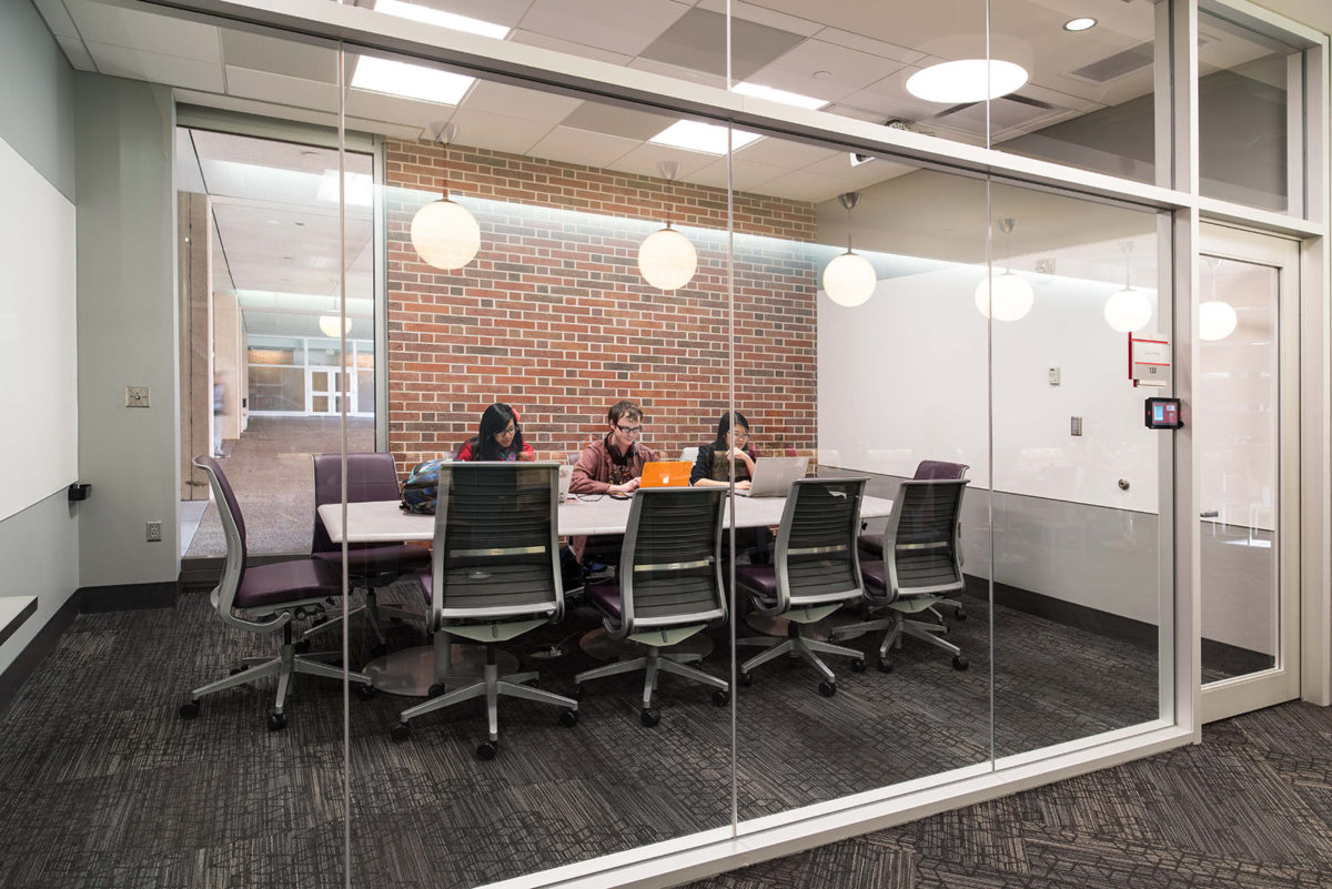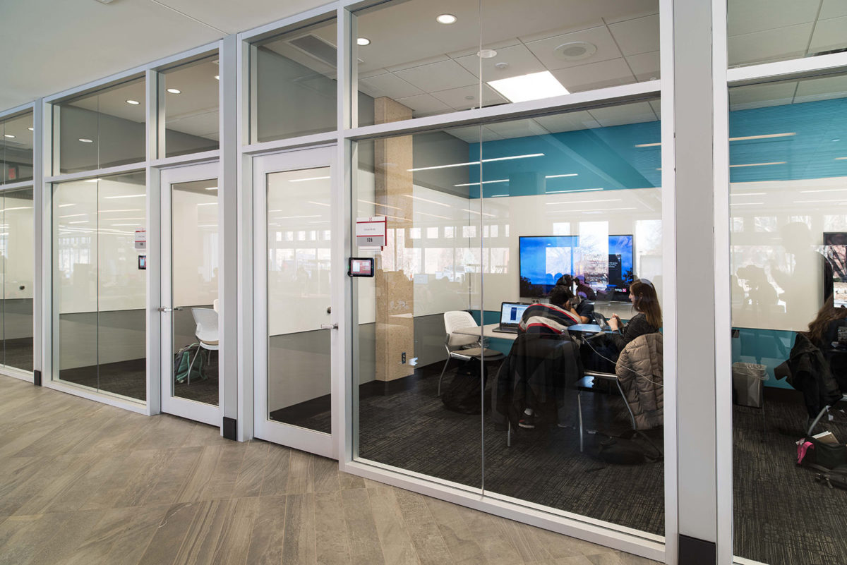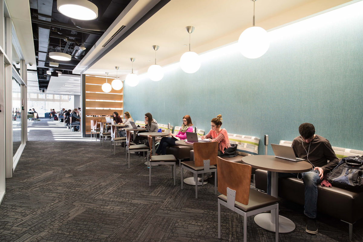 The transformation of Love Library’s first floor into a Learning Commons required an overhaul of a traditional library space to include more study area and fewer books. The north entry was also reopened with a new iconic feature and outdoor plaza.