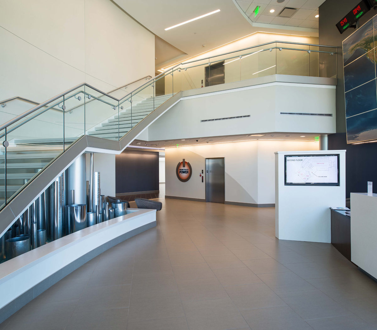 - Two-story entrance featuring a world map with each Valmont location
